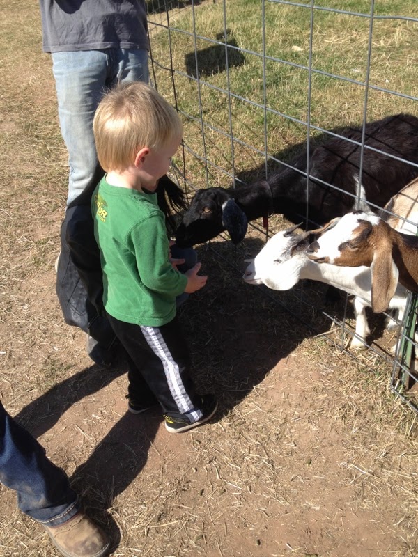 Feeding the goats. Daxsen dropped most of his food pellets on the ground, but the goats still enjoyed licking his hands.